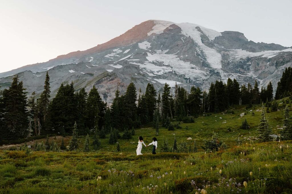 We know that there are so many other (more fun) parts to planning your elopement, but don’t forget about the legalities, too! Mount Rainier National Park requires a wedding permit and has specific guidelines around ceremony locations, guest counts, and park regulations. You’ll also need a valid Washington State marriage license to make your elopement official. It might sound a little intimidating at first, but once you understand the requirements, the process is straightforward and totally doable! We’re always happy to help with these logistics.